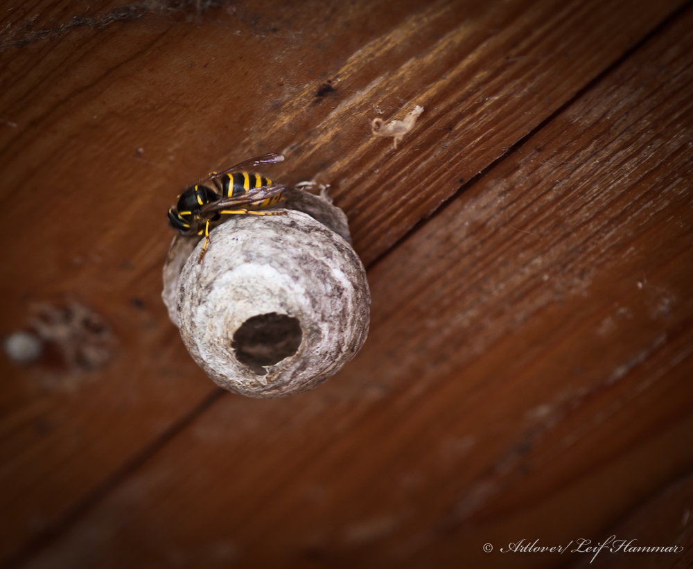 Jag var nästan hemma hos den här gul- och svartrandiga krabatens bo när jag tog den här bilden, och det var väl tur det. Den höll på bygga sitt bo under verandataket i stugan och jag fick uppgiften att göra av med det så man inte blir stungen hemma hos mig på landet.
